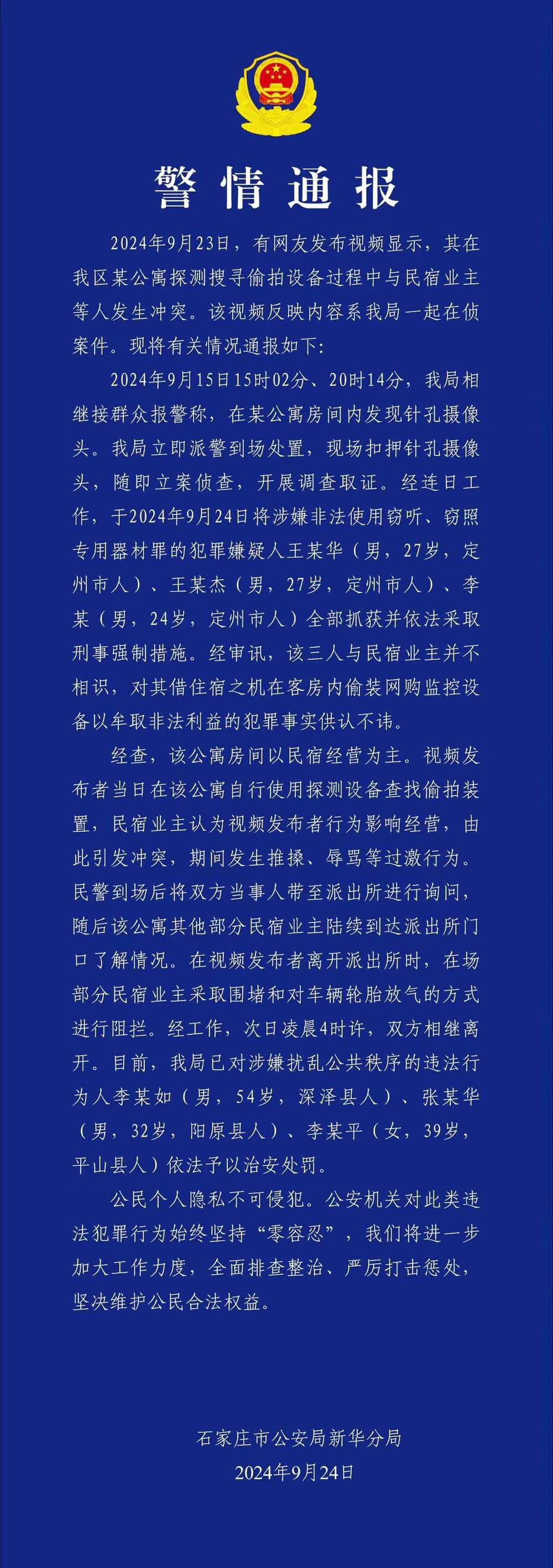 当晚,石家庄市公安局新华分局发布通报,已将涉嫌非法使用窃听、窃照专用器材罪的犯罪嫌疑人王某华、王某杰、李某全部抓获并依法采取刑事强制措施;已对涉嫌扰乱公共秩序的违法行为人李某如、张某华、李某平依法予以治安处罚。