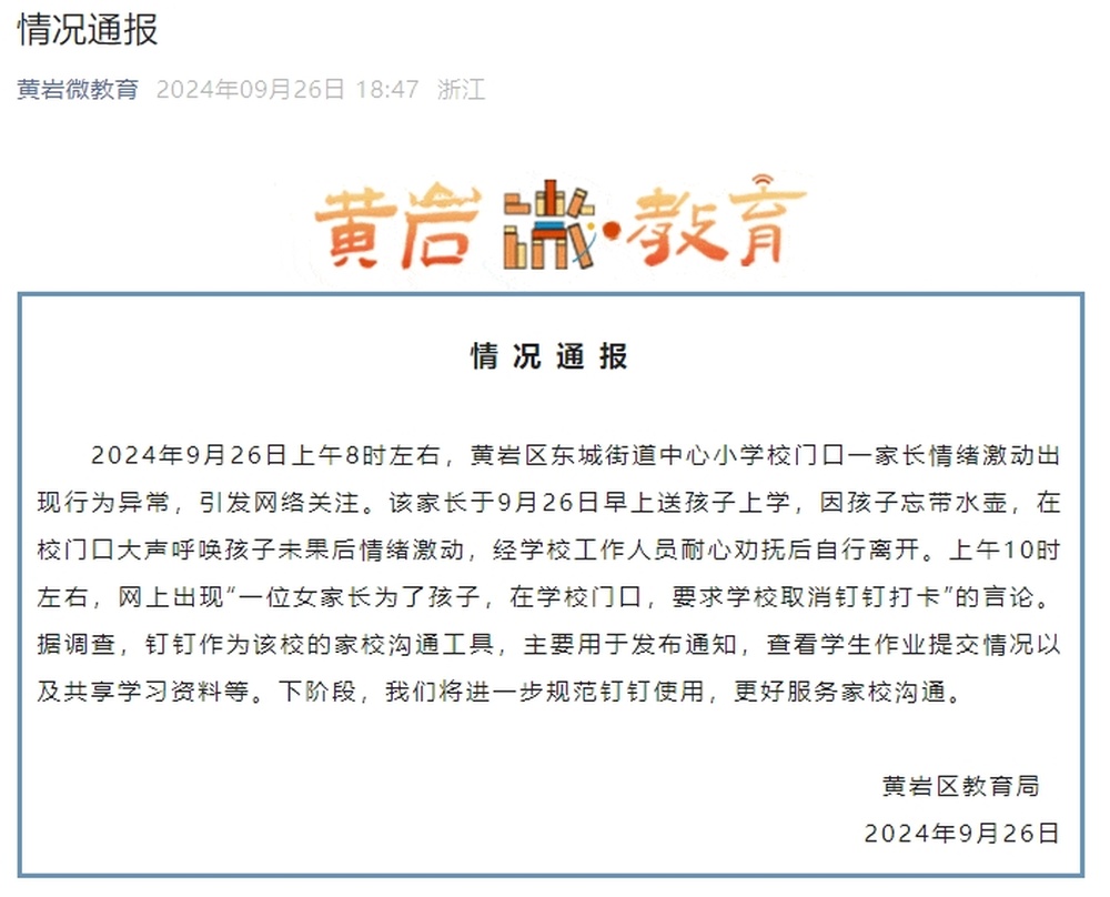 9月26日,浙江台州有网友发布视频反映,在台州市一小学门口,一名学生家长跪地大声吁请校长取消钉钉打卡。当日下午,台州市黄岩区教育局工作人员回应奔流新闻记者采访时称,视频反映的内容正在调查中,但目前可以肯定的是跟“钉钉”没有关系。