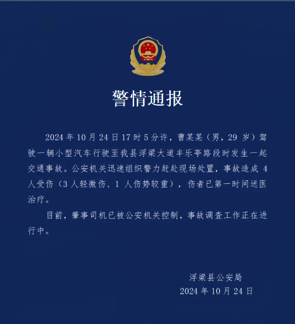 江西景德镇浮梁县公安局通报,10月24日17时5分许,曹某某(男,29岁)驾驶一辆小型汽车行驶至浮梁大道丰乐亭路段时发生一起交通事故。公安机关迅速组织警力赶赴现场处置,事故造成4人受伤(3人轻微伤、1人伤势较重),伤者已第一时间送医治疗。目前,肇事司机已被公安机关控制,事故调查工作正在进行中。