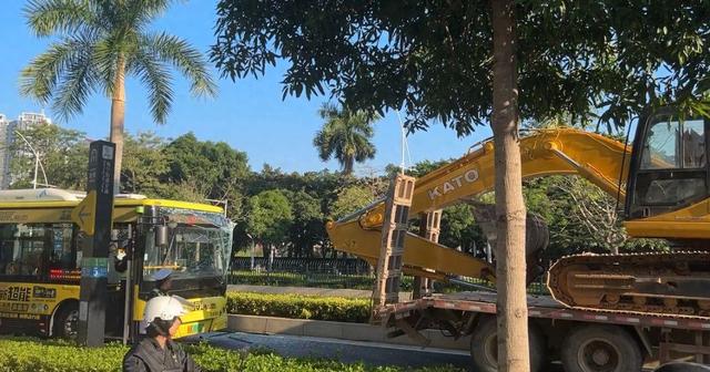 据网民发布的视频显示,街头一辆公交车前面挡风玻璃已经破碎,地上满是碎玻璃。在公交车前方几米处,一辆货车装载着一辆挖机停在路上,现场有身穿警服的工作人员正在处置。
