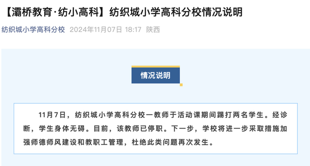 西安市灞桥区纺织城小学高科分校发布情况说明称,11月7日,纺织城小学高科分校一教师于活动课期间踢打两名学生。经诊断,学生身体无碍。目前,该教师已停职。下一步,学校将进一步采取措施加强师德师风建设和教职工管理,杜绝此类问题再次发生。