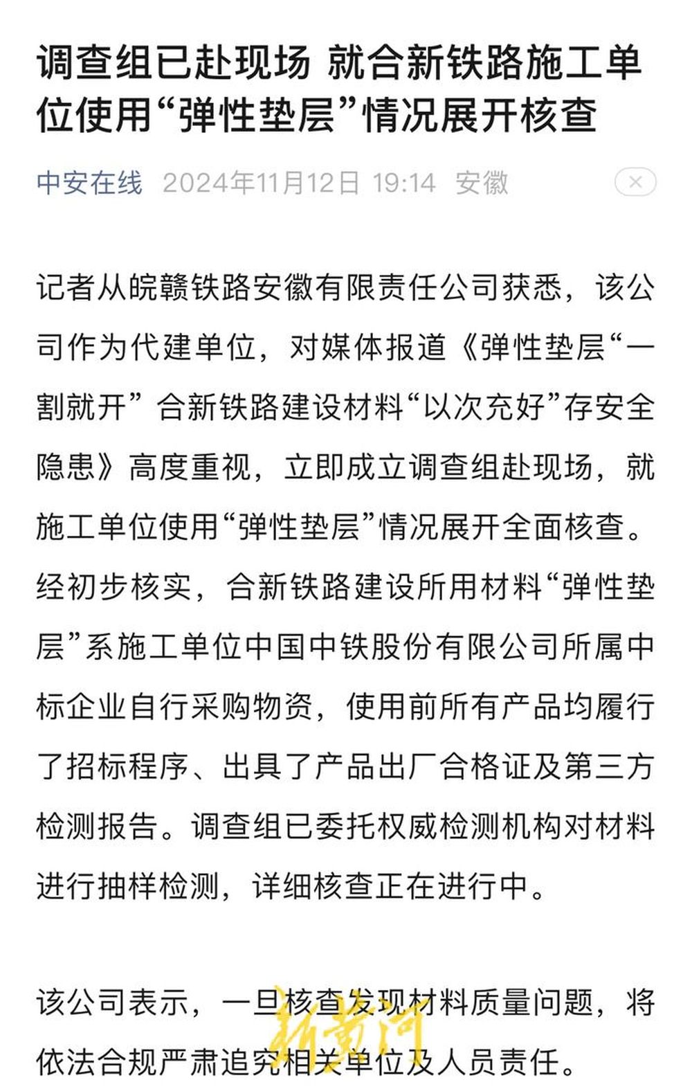 据悉,11月12日,《经济参考报》的二位记者王文志、程子龙,曾刊发重磅调查报道《弹性垫层“一割就开”,合新铁路建设材料“以次充好”存安全隐患》,揭露合新铁路(合肥至新沂)多家施工单位为节省成本,以次充好,违规将“三元乙丙橡胶弹性垫层”偷换为不符合铁路行业标准的“再生胶仿制品”,这些仿冒品性能远低于设计要求,存在安全隐患。报道刊发后引发轰动,相关单位立即成立调查组赴现场,并已委托权威检测机构对材料进行抽样检测,详细核查正在进行中。