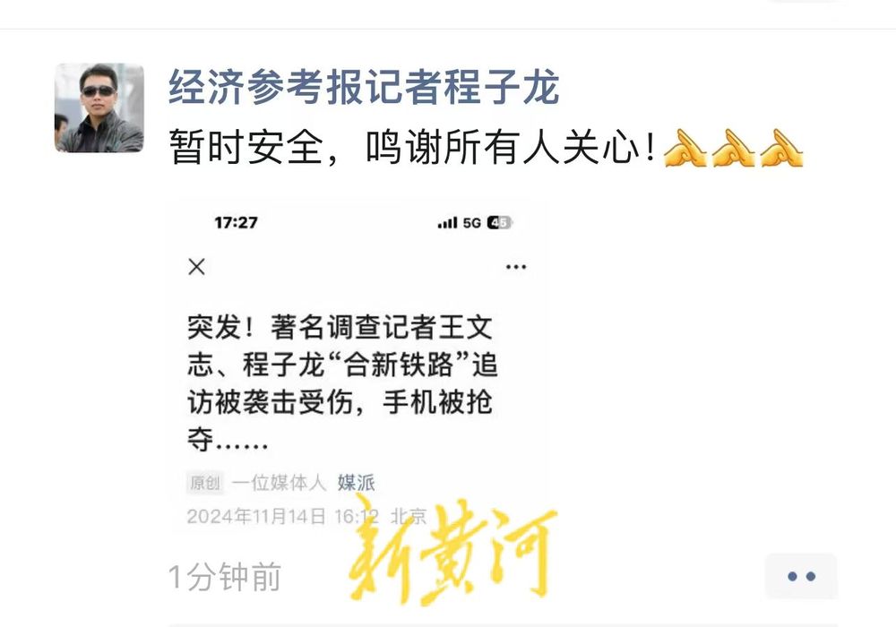 11月14日下午,新黄河记者就此事拨打《经济参考报》记者王文志手机,他表示目前两人在派出所,人是安全的,事情确实是这么个事情,感谢同行关心。之后新黄河记者成功联系上记者程子龙,他表示,“我们正在派出所做笔录,民警暂时不允许我们接听电话,一会方便的时候会回电。”对于网传打人的是中铁七局下属企业人员,新黄河记者联系上中铁七局宣传部,工作人员称还不知道(不掌握)下属单位人员殴打新华社记者一事,表示会马上去了解相关情况。