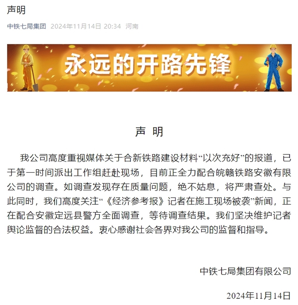 11月14日晚间,中铁七局集团有限公司发布声明:我公司高度重视媒体关于合新铁路建设材料“以次充好”的报道,已于第一时间派出工作组赶赴现场,目前正全力配合皖赣铁路安徽有限公司的调查。如调查发现存在质量问题,绝不姑息,将严肃查处。与此同时,我们高度关注“《经济参考报》记者在施工现场被袭”新闻,正在配合安徽定远县警方全面调查,等待调查结果。我们坚决维护记者舆论监督的合法权益。衷心感谢社会各界对我公司的监督和指导。