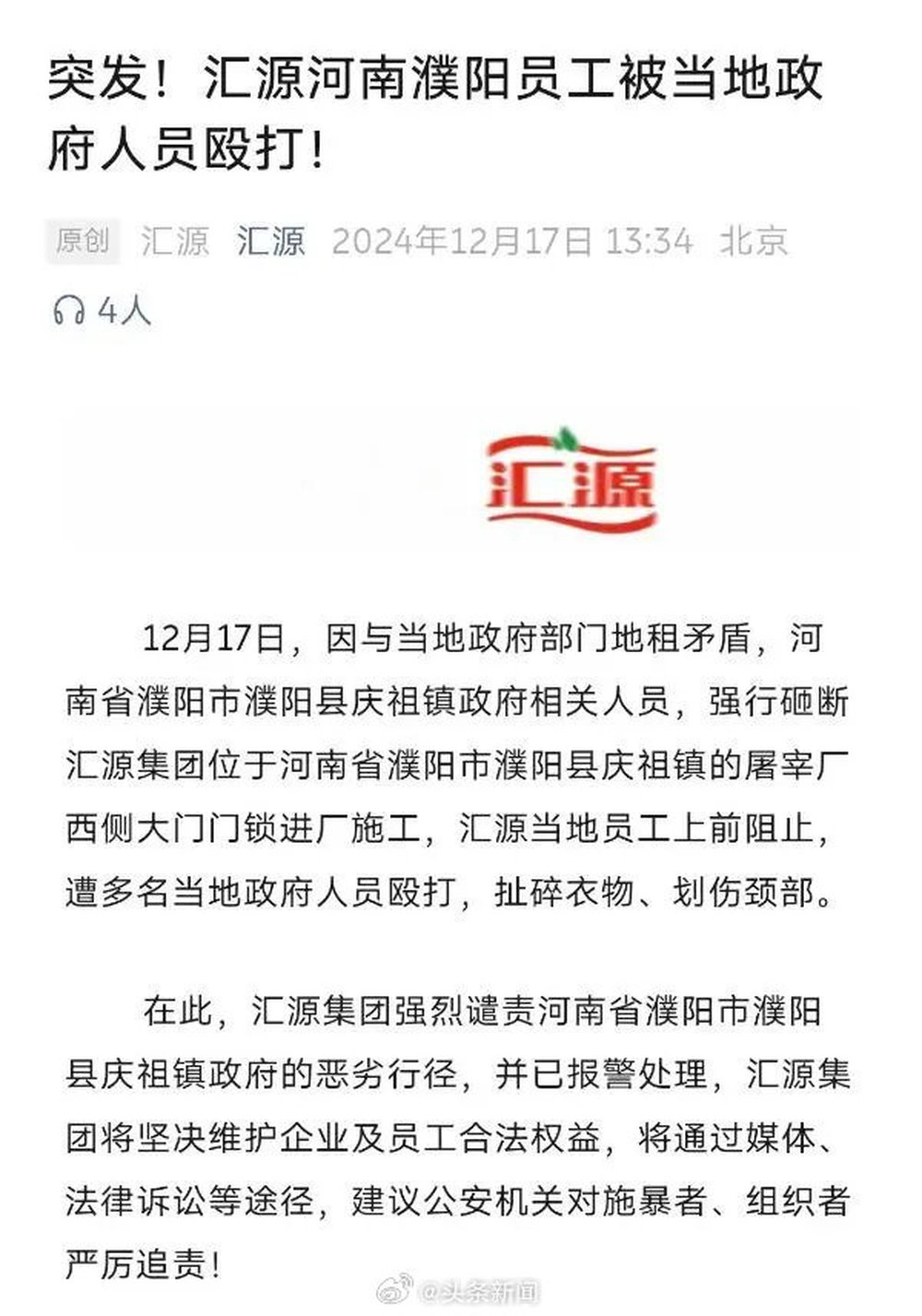 文章表示,12月17日,因与当地政府部门地租矛盾,河南省濮阳市濮阳县庆祖镇政府相关人员,强行砸断汇源集团位于河南省濮阳市濮阳县庆祖镇的屠宰厂西侧大门门锁进厂施工,汇源当地员工上前阻止,遭多名当地政府人员殴打,扯碎衣物、划伤颈部。