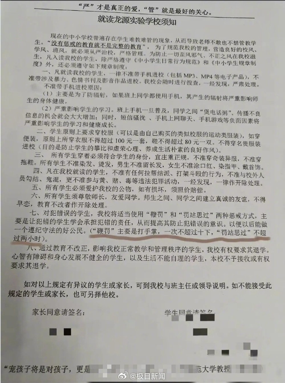 2月14日有网友发帖称,广东阳江的龙源实验学校要求学生和家长在校规上签字,同意体罚犯错学生,否则就另择他校。