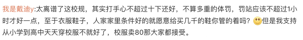 对于此事,网友意见不一。有人认为,如果孩子确实屡教不改,可以用打手掌这样的方式适当惩戒。也有网友认为,体罚学生违法,学校这是罔顾法律。对于校规中要求衣服不超过100元鞋子不超过80元,网友认为,属实没有必要。