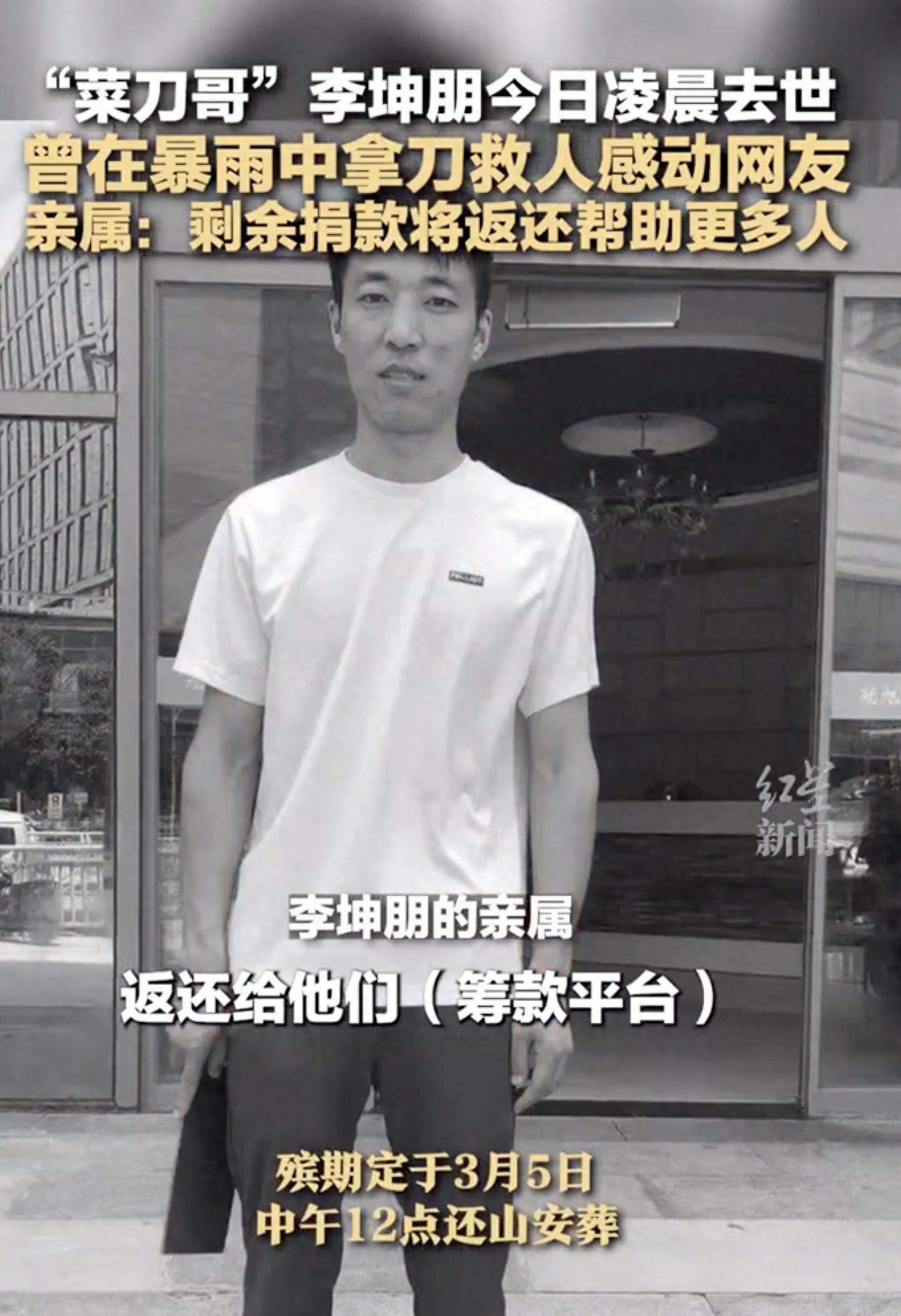 3月3日, 李坤朋妻子发布讣告,李坤朋因病抢救无效,于今日凌晨1时40分去世,享年39岁,殡期定于3月5日中午12点还山安葬。2021年7月暴雨突袭郑州,一辆黑色轿车被雨水淹没,危急时刻,李坤朋拿菜刀前去救人曾感动无数网友,被网友亲切地称作“菜刀哥”。李坤朋亲属接受红星新闻采访时透露,李坤朋走得比较着急,没有用完的捐款,会返还给筹款平台,给更多需要帮助的人。