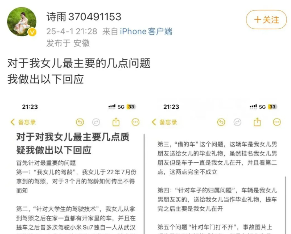 据悉,王女士的女儿是小米SU7的驾驶人,事故发生后,王女士曾在微博上发帖描述了事发大概经过,并提出小米发布通告说会成立调查组,但是从事件发生到现在,小米方面从来没有人联系过他们,也没有来过一个慰问电话。事情在网上发酵后,王女士疑似遭到了不少网友的质疑,甚至还有网友称其女儿只有3个月驾龄,4月1日晚9点多,王女士又专门在微博上发帖进行了回应,希望广大网友不要以讹传讹。