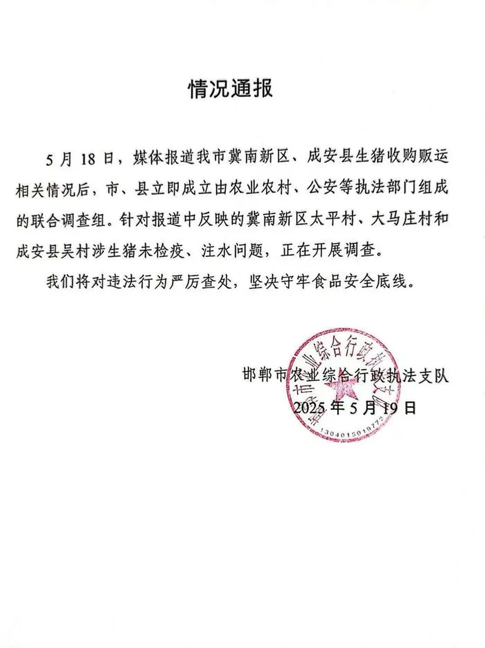 5月19日,河北邯郸市农业综合行政执法支队通报: