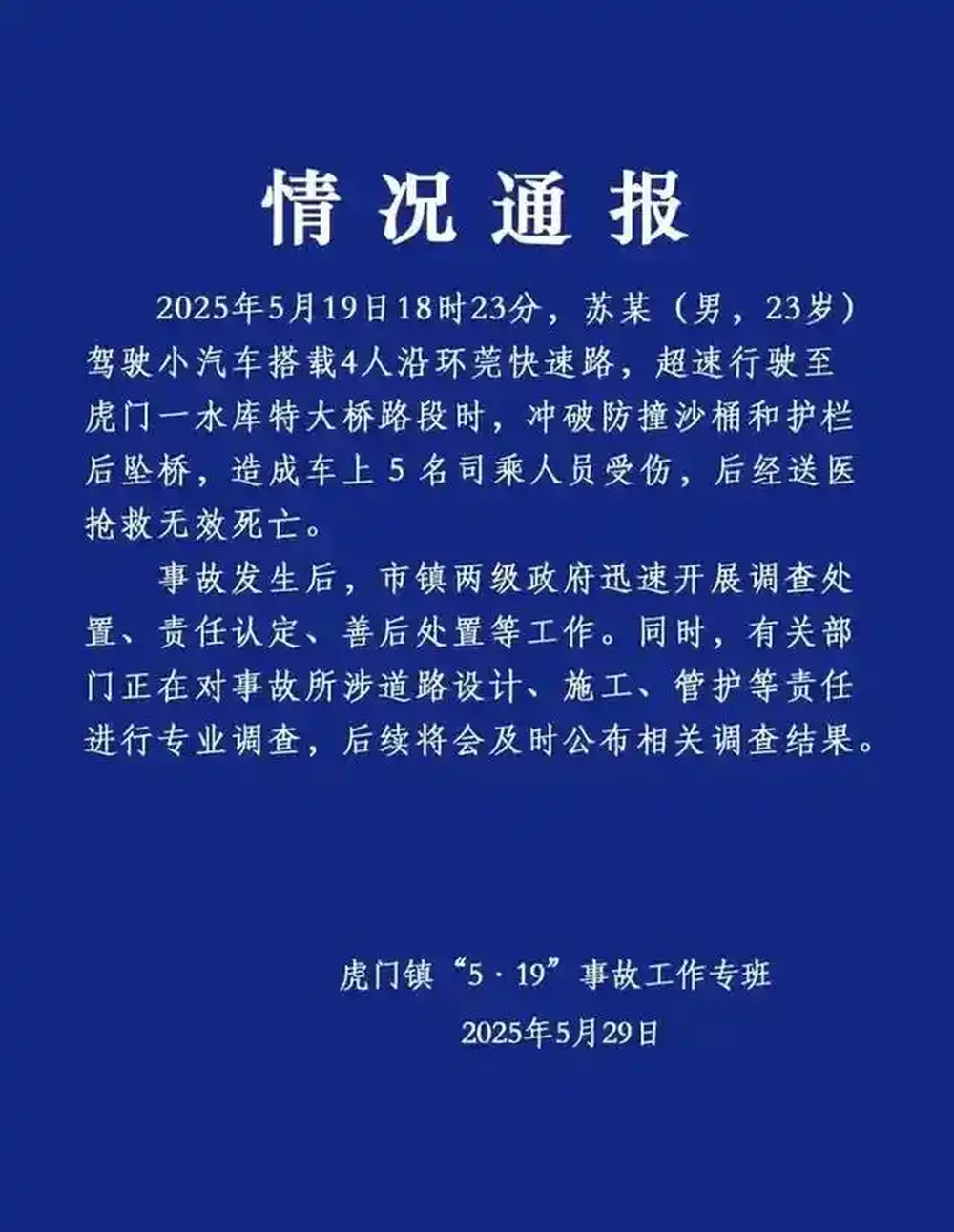5月29日,广东虎门镇“5·19”事故工作专班通报,5月19日18时23分,苏某(男,23岁)驾驶小汽车搭载4人沿环莞快速路,超速行驶至虎门一水库特大桥路段时,冲破防撞沙桶和护栏后坠桥,造成车上5名司乘人员受伤,后经送医抢救无效死亡。事故发生后,市镇两级政府迅速开展调查处置、责任认定、善后处置等工作。同时,有关部门正在对事故所涉道路设计、施工、管护等责任进行专业调查,后续将会及时公布相关调查结果。