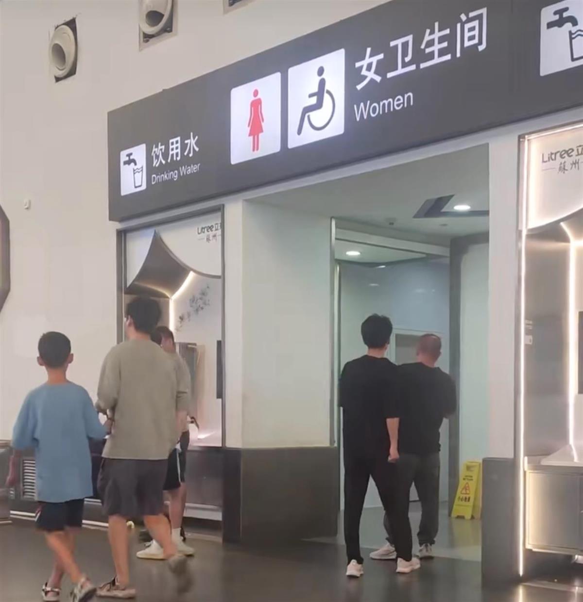 视频画面显示,该站女厕所入口上方设有两个标识:一个醒目的红色穿裙子小人,另一个是灰色的坐轮椅小人(代表无障碍卫生间)。尽管标识旁边明确写有“女卫生间”字样,但仍有不少男士径直走向该区域。他们在门口往往会露出疑惑的神情,稍作迟疑后才意识到这是女卫生间,随即退出并进行确认。