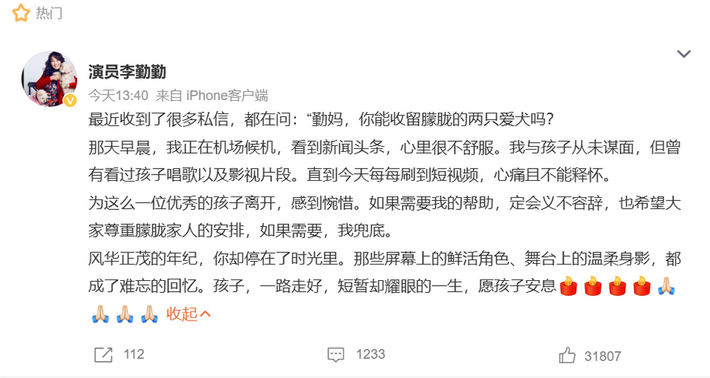 文中李勤勤这样写道:最近收到了很多私信,都在问,“勤妈,你能收留朦胧的两只爱犬吗?”那天早晨,我正在机场候机,看到新闻头条,心里很不舒服。我与孩子从未谋面,但曾有看过孩子唱歌以及影视片段。直到今天每每刷到短视频,心痛且不能释怀。为这么一位优秀的孩子离开,感到惋惜。如果需要我的帮助,定会义不容辞,也希望大家尊重朦胧家人的安排,如果需要,我兜底。风华正茂的年纪,你却停在了时光里。那些屏幕上的鲜活角色、舞台上的温柔身影,都成了难忘的回忆。孩子,一路走好,短暂却耀眼的一生,愿孩子安息。