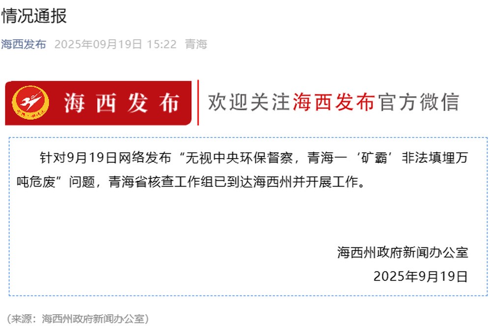 2025年9月19日,《无视中央环保督察 青海一“矿霸”非法填埋万吨危废》视频、文稿在网络发布后,海西州委、州政府高度重视,已成立海西州、大柴旦行委调查组赴现场开展核查工作,并调集化工专业人员进行环境检测,后续将根据核查和检测结果依法依规处理。