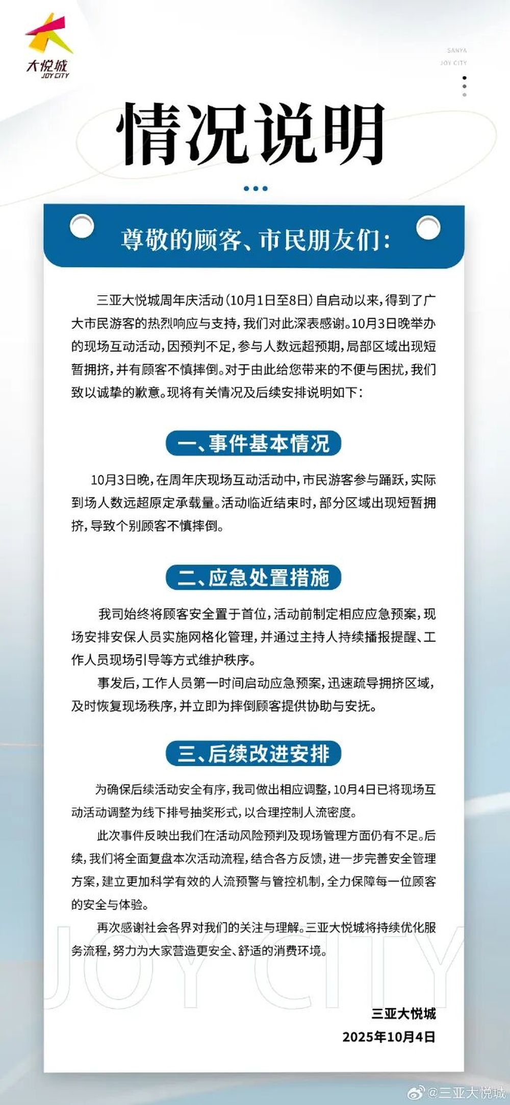 10月3日晚举办的现场互动活动,因预判不足,参与人数远超预期,局部区域出现短暂拥挤,并有顾客不慎摔倒。对于由此给您带来的不便与困扰,我们致以诚挚的歉意。现将有关情况及后续安排说明如下: