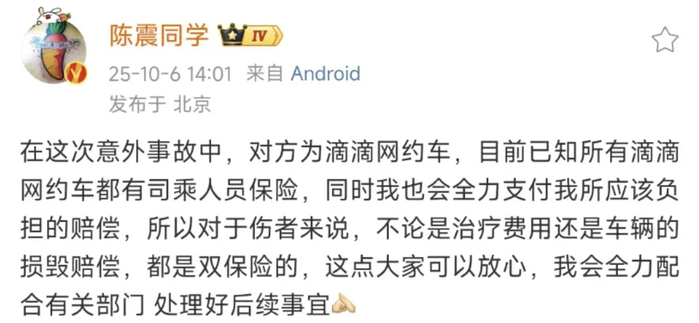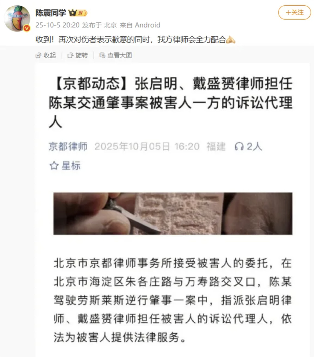 10月5日晚,陈震再次发声。陈震发文称,“再次对伤者表示歉意的同时,我方律师会全力配合。”其配发的照片为“京都律师”微信公众号的一则推文的截图。
