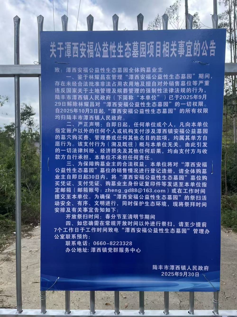“广东陆丰一墓园被查处后疑仍在销售”一事经报道后,目前当地已发出公告:2025年9月29日解除林耀昌对“潭西安福公益性生态墓园”的一切权限。自2025年10月3日起,“潭西安福公益性生态墓园”的所有权限均归陆丰市潭西镇人民政府。