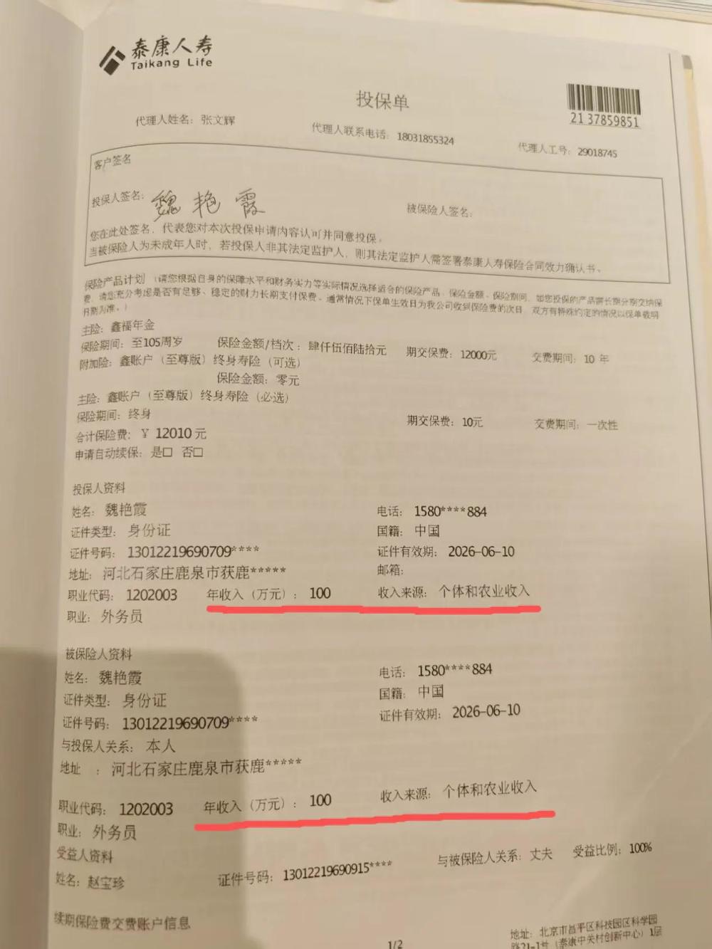 此外,指尖新闻记者还发现,在多份保险合同中,魏艳霞作为投保人,她的年收入都被标注为100万元,而她的丈夫赵宝珍的年收入也是100万元,相当于她家的年收入至少有200万元,这几乎是她家实际年收入的10倍。