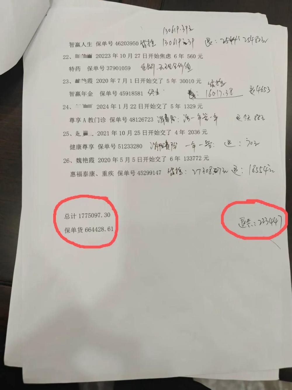 据赵宝珍介绍,发现妻子被诱导买了这么多保险后,他曾多次找到“泰康人寿”在鹿泉区的分公司要求退赔损失,但是对方以“自愿购买,没有违规”为由,让他找“泰康人寿”石家庄中心支公司处理。而他到“泰康人寿”石家庄中心支公司后,工作人员只是通过计算告知他,算上2008年购买的保险,魏艳霞在“泰康人寿”一共购买了26份保险,已经交纳保费177.5万余元,目前根据保单价值,如果退保,只能退回22.3万余元。