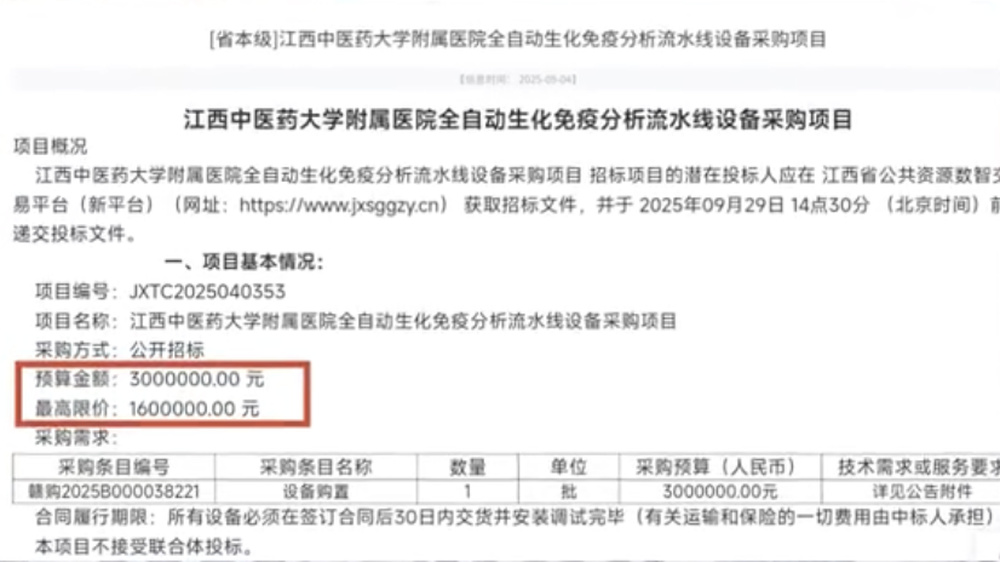 江西中医药大学10月15日发布情况通报称,10月14日,有媒体反映,该校附属医院一设备采购项目存在“300万元预算,1000元中标”的情况。