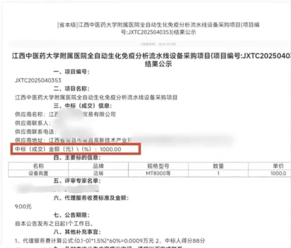 据大皖新闻报道,近日,江西一则中标结果公示引发关注。江西中医药大学附属医院全自动生化免疫分析流水线设备采购项目预算300万元,但中标价格仅1000元。