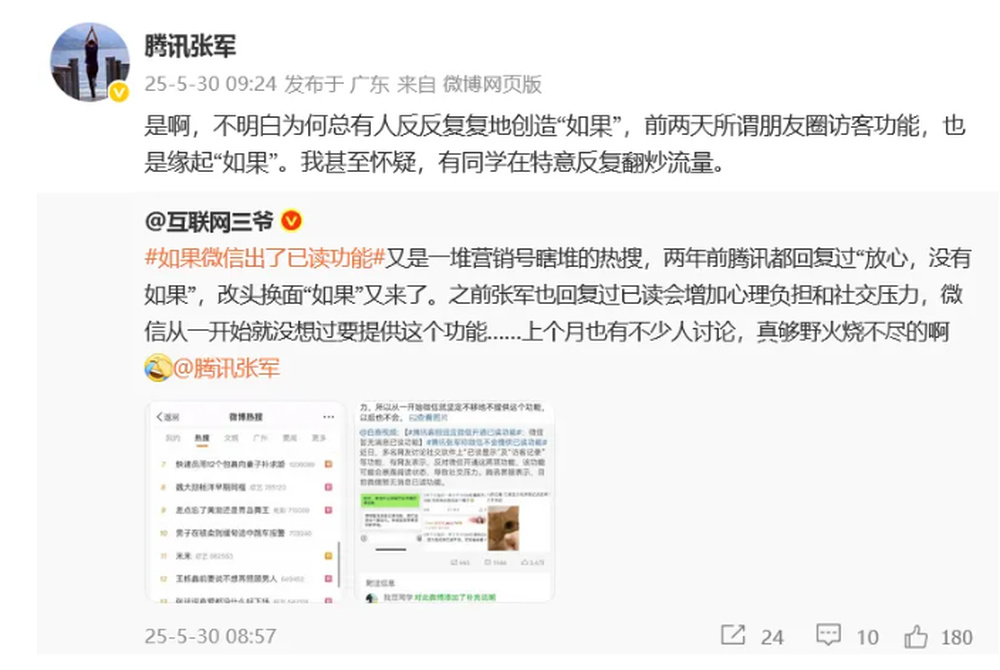 此后,腾讯公关总监张军又发文辟谣“微信如果推出朋友圈访客”和“如果微信推出已读功能”两个热门话题。他表示,不明白为何总有人反反复复地创造“如果”,前两天所谓朋友圈访客功能,也是缘起“如果”,“我甚至怀疑,有同学在特意反复翻炒流量。”