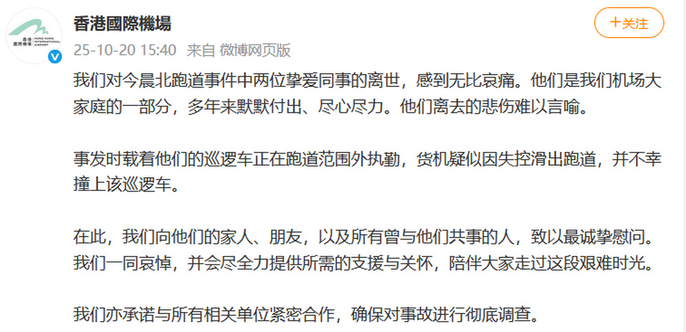 我们对今晨北跑道事件中两位挚爱同事的离世,感到无比哀痛。他们是我们机场大家庭的一部分,多年来默默付出、尽心尽力。他们离去的悲伤难以言喻。