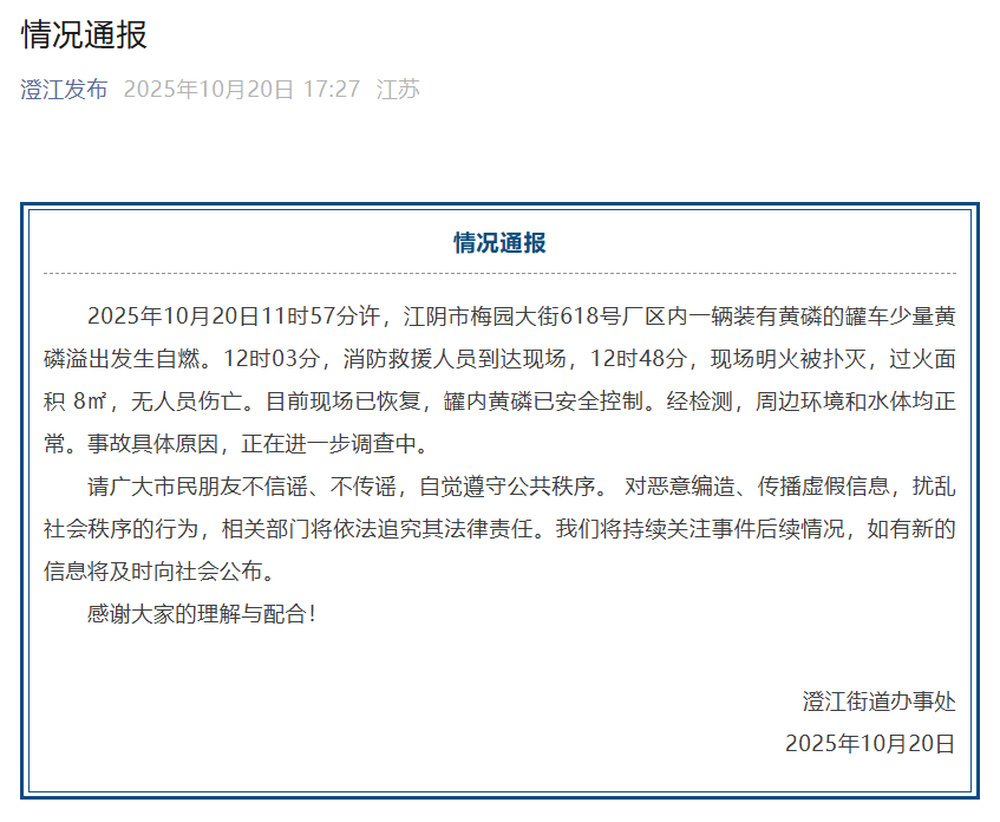 2025年10月20日11时57分许,江阴市梅园大街618号厂区内一辆装有黄磷的罐车少量黄磷溢出发生自燃。12时03分,消防救援人员到达现场,12时48分,现场明火被扑灭,过火面积8㎡,无人员伤亡。目前现场已恢复,罐内黄磷已安全控制。经检测,周边环境和水体均正常。事故具体原因,正在进一步调查中。