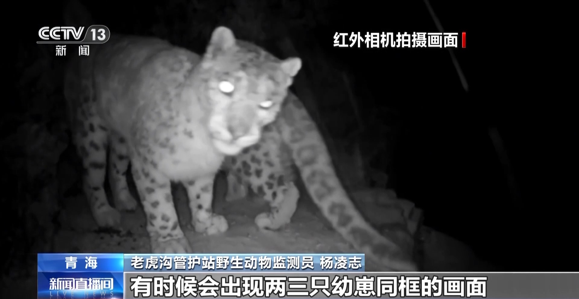 老虎沟管护站野生动物监测员 杨凌志:这几年,我们通过红外相机监测到雪豹的个体在增加,以前一年也拍不到几次,现在不仅能拍到,而且不止一只,有时候会出现三两只幼崽同框的画面,说明雪豹在这里繁衍得很好。