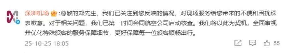 25日傍晚,深圳机场官方微博在留言区致歉: