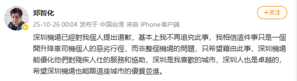 随后,郑智化回应称,深圳机场已经对他个人提出道歉,他不再追究此事,相信这件事只是一个开升降车司机个人的恶劣行径,而非整个机场的问题,只希望借由此事,深圳机场能优化对残疾人士的服务和协助。