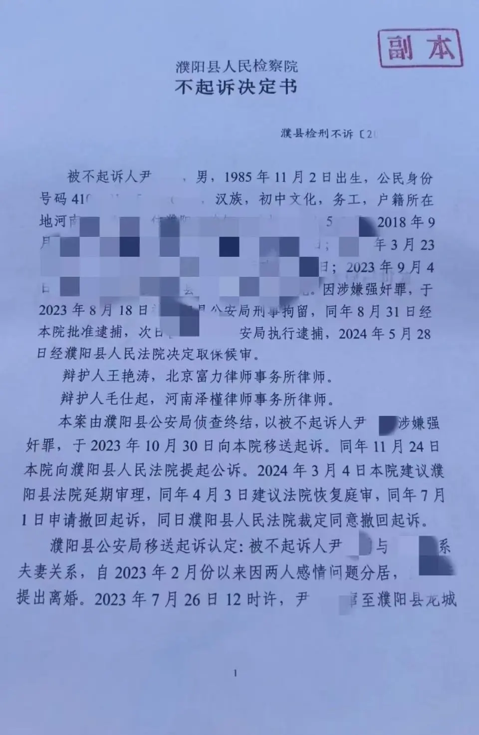 7月31日,濮阳县检察院出具《不起诉决定书》,本案现有证据不足,达不到起诉条件,决定不予起诉。