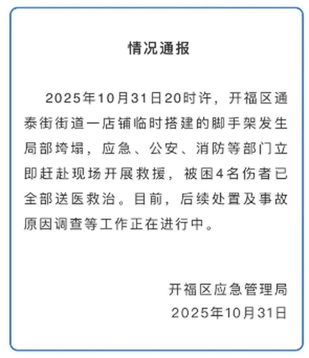 10月31日晚8时许,多名网友在社交平台发布视频,称湖南长沙开福区潮宗街发生垮塌事故,有人受伤。10月31日晚10时,长沙市应急管理局工作人员回应新黄河记者称,相关部门已经赶赴现场救援,具体受伤情况还不清楚。