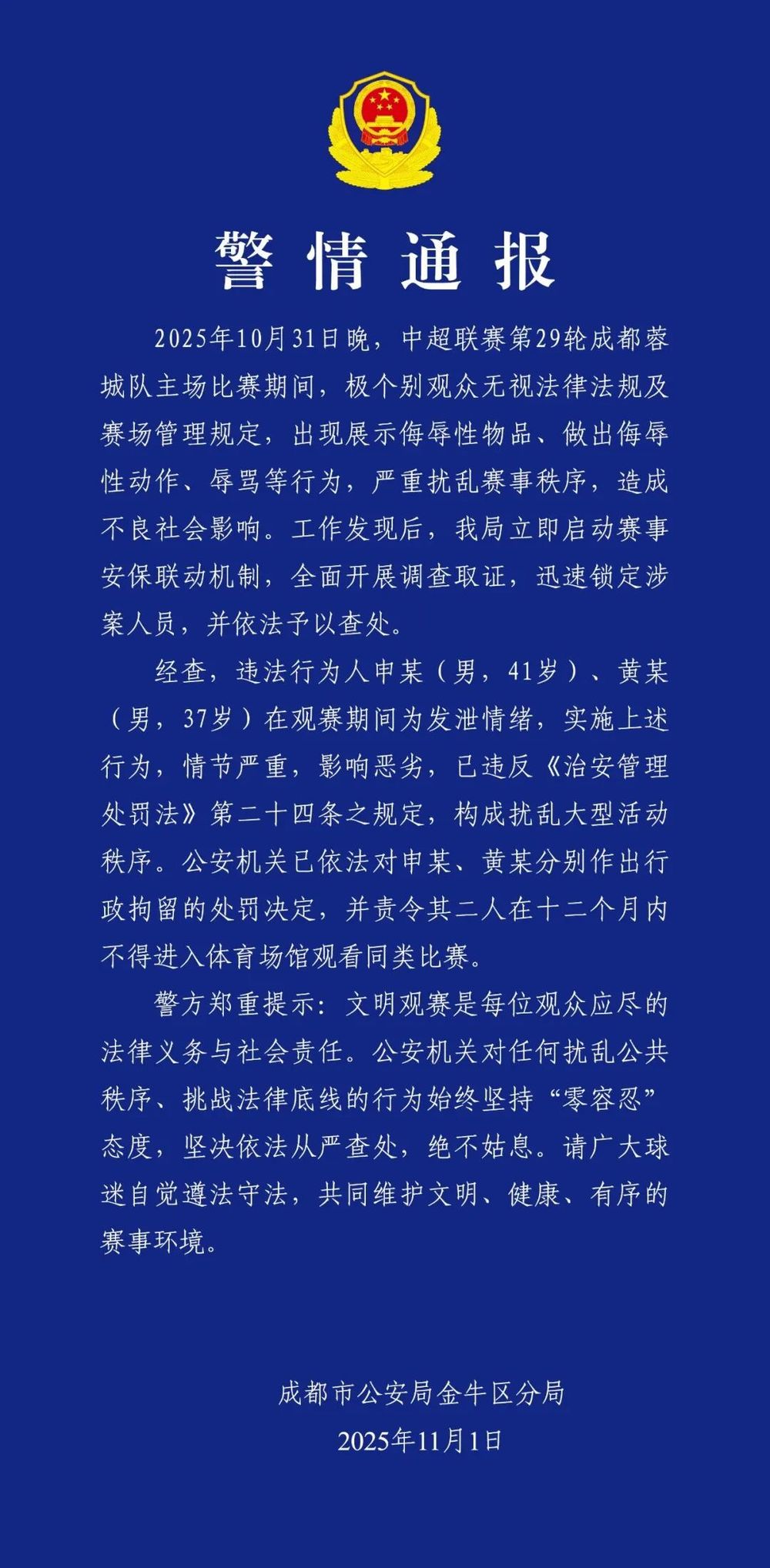 2025年10月31日晚,中超联赛第29轮成都蓉城队主场比赛期间,极个别观众无视法律法规及赛场管理规定,出现展示侮辱性物品、做出侮辱性动作、辱骂等行为,严重扰乱赛事秩序,造成不良社会影响。