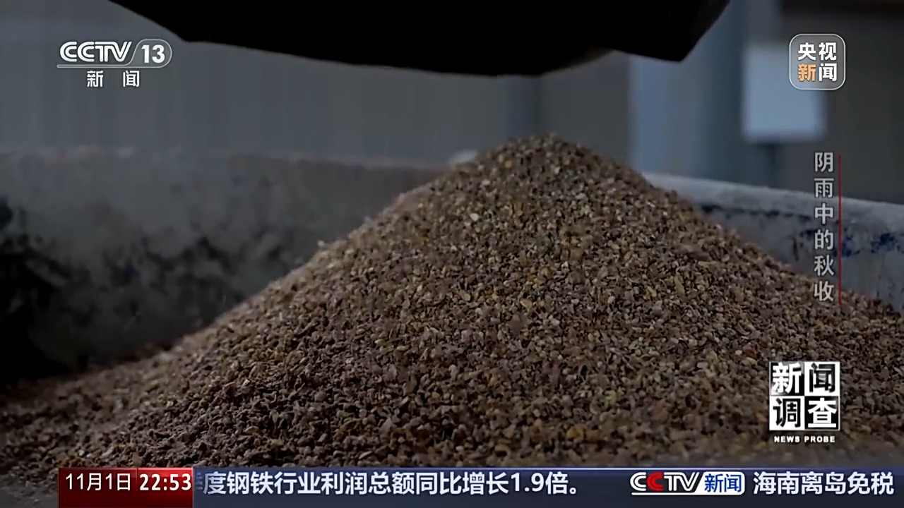 在烘干塔的进粮口,我们看到了今天刚刚抢收上来的玉米籽粒。但质量相较于往年,还是有所差别。