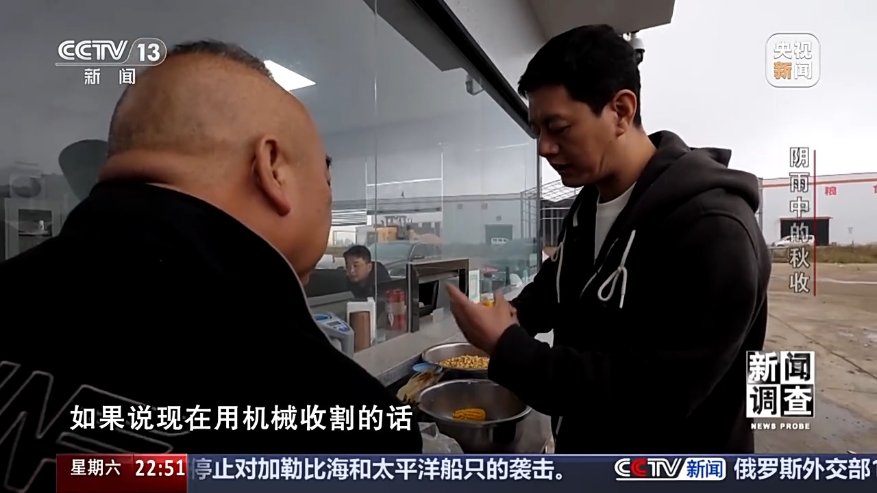 机器收割玉米籽粒时,会通过巨大的旋转力将籽粒与棒子分离,如果玉米湿度过大,就容易造成籽粒破损。刘海峰建议,承包户可以等待几个晴天后,再进行收割。