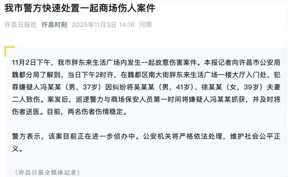 11月2日下午,河南许昌市胖东来生活广场内发生一起故意伤害案件。许昌日报记者向许昌市公安局魏都分局了解到,当日下午2时许,在魏都区南大街胖东来生活广场一楼大厅入门处,犯罪嫌疑人冯某某(男,37岁)因纠纷将吴某某(男,41岁)、徐某某(女,39岁)夫妻二人致伤。案发后,巡逻警力与商场保安人员第一时间将嫌疑人冯某某抓获,并及时将伤者送医。目前,两名伤者伤情稳定。