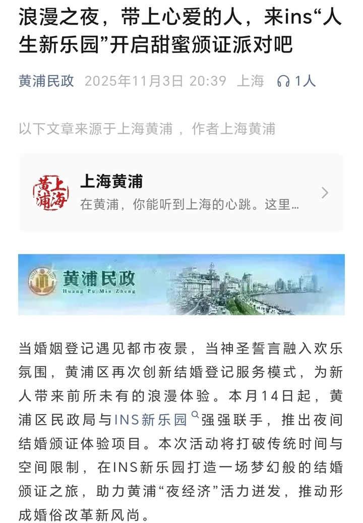 该文章还介绍说,在黄浦区,婚姻登记服务不断创新早已不是新鲜事。从“凤祥喜事”结婚登记颁证点的启用,“喜事伙伴”计划的推出到七夕节的“次元红线·豫见良缘”夜间颁证仪式以及滨江无人机飞行送祝福,区民政局一直致力于为新人创造难忘的登记体验。此次夜间结婚颁证体验项目是黄浦区婚姻登记服务的又一次创新尝试。活动将于2025年11月14日至11月22日每周五周六,在INS新乐园举行,为新人们提供独具特色的沉浸式夜间结婚颁证服务与“齐家宜室”婚姻家庭辅导服务。