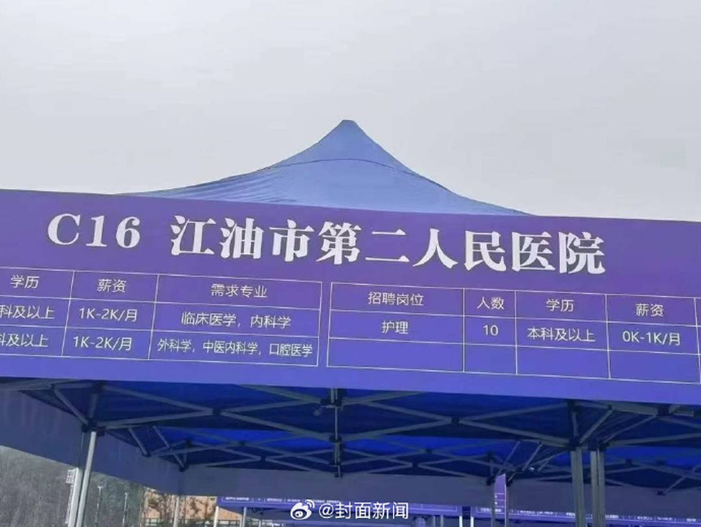 据封面新闻报道:11月4日,有网友向记者反映,在四川一场双选会现场,江油市第二人民医院的展位前,一份招聘简章吸引了众多学生注意。简章显示,该院正在招聘内科、外科医生及护理人员,其中护理岗位要求“本科及以上学历”,而月薪一栏写着“0元-1000元/月”。
