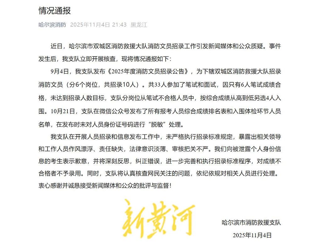 9月4日,我支队发布《2025年度消防文员招录公告》,为下辖双城区消防救援大队招录消防文员(分6个岗位,共招录10人)。共33人参加了笔试和面试,因只有6人笔试成绩合格,未达到招录人数目标,支队分岗位从笔试不合格人员中,按综合成绩从高到低另选4人入围。10月21日,支队在微信公众号发布了所有报考人员综合成绩排名表和入围体检环节人员名单,在发布时未对人员身份证号码进行“脱敏”处理。