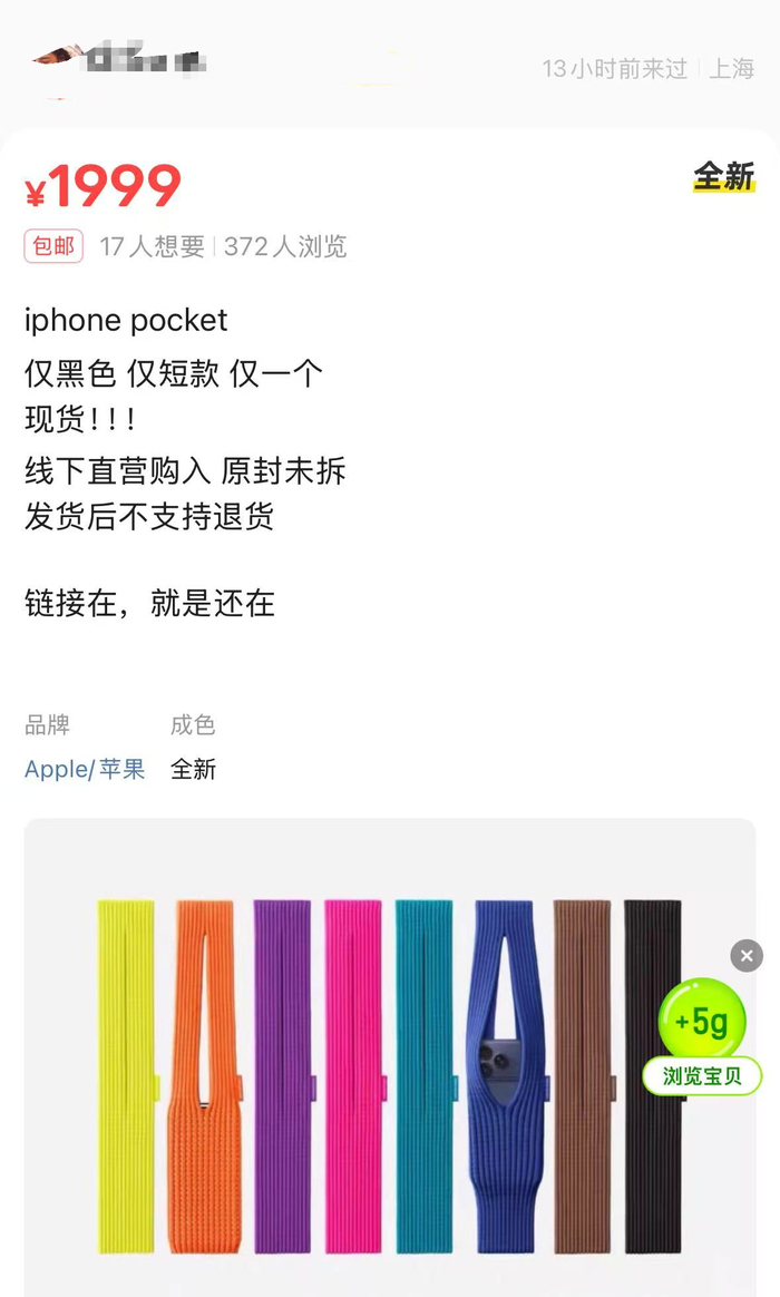 “我是在官网抢到的,收到货没有拆封,就直接挂在了二手交易平台。”一位卖家告诉记者,他在发布首日买到了1299元的iPhone Pocket。“最近几天很多人来询单,我陆续收到了20多人询问产品的消息。”
