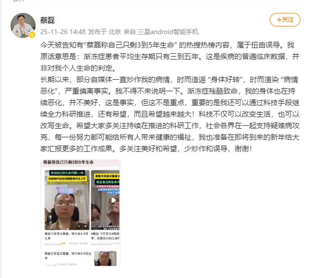 今天被告知有“蔡磊称自己只剩3到5年生命” 的热搜热榜内容,属于扭曲误导。我原话意思是:渐冻症患者平均生存期只有三到五年。这是疾病的普遍临床数据,并非对我个人生命的判定。