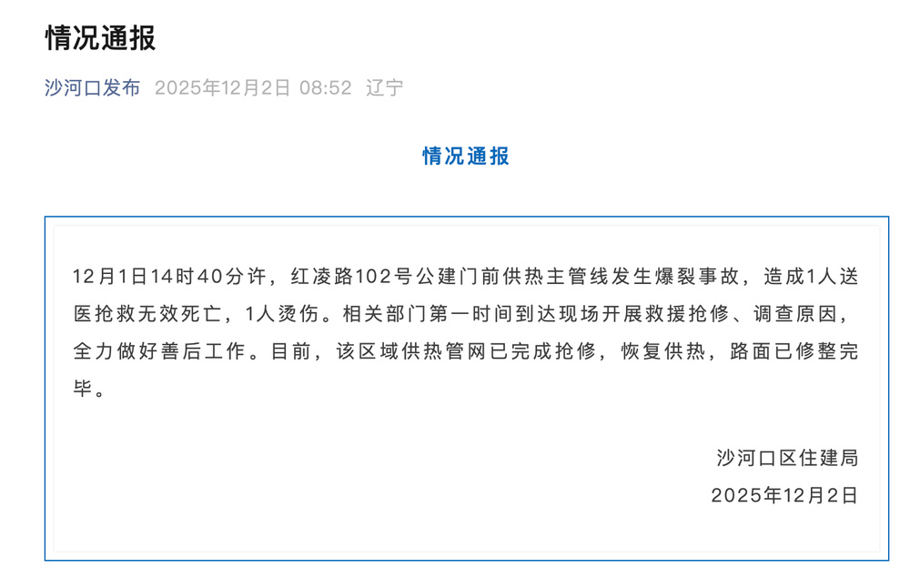 据“沙河口发布”微信公众号消息,大连沙河口区住建局通报“一供热主管线发生爆裂事故”: