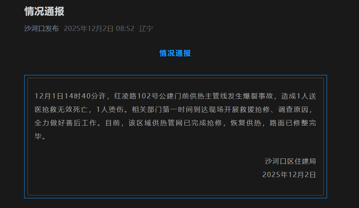 12月2日,大连市沙河口住建局发布情况通报称:“12月1日14时40分许,红凌路102号公建门前供热主管线发生爆裂事故,造成1人送医抢救无效死亡,1人烫伤。相关部门第一时间到达现场开展救援抢修、调查原因,全力做好善后工作。目前,该区域供热管网已完成抢修,恢复供热,路面已修整完毕。”