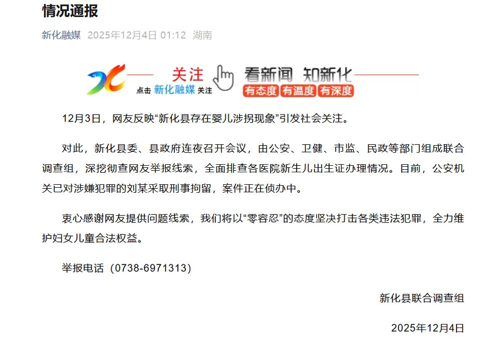 12月3日,网友反映“新化县存在婴儿涉拐现象”引发社会关注。