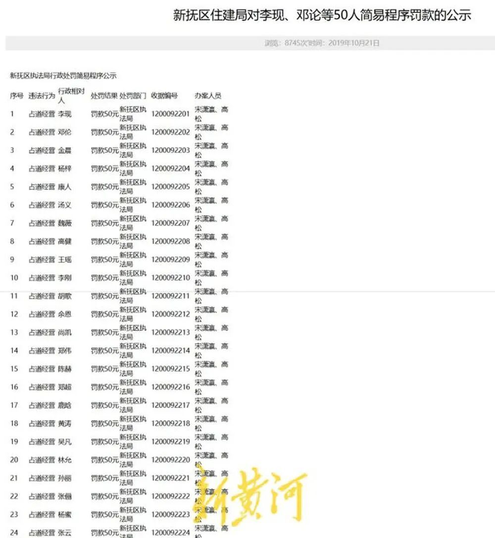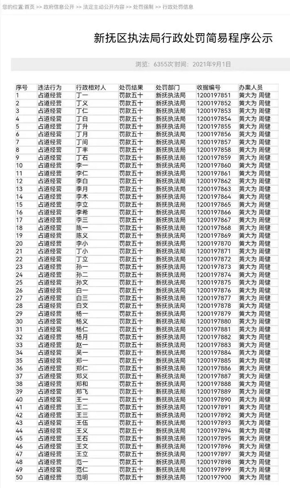 另据极目新闻报道,记者还注意到,新抚区执法局2021年9月1日还公示了多人占道经营被行政处罚的文件,名单上50人均被罚款50元,名单合计罚款2500元。记者看到,该名单上被罚款的有丁一、李一、陈一、孙一、白一、赵一、吴一、郑一、杨一、王一、范一,还有丁义、陈义、杨义、王义,都是两个字的姓名。