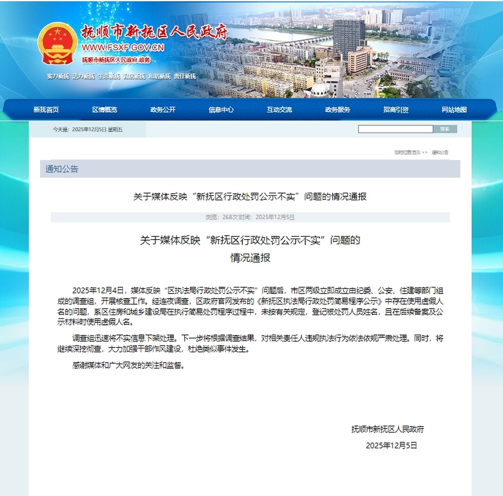 2025年12月4日,媒体反映“区执法局行政处罚公示不实”问题后,市区两级立即成立由纪委、公安、住建等部门组成的调查组,开展核查工作。经连夜调查,区政府官网发布的《新抚区执法局行政处罚简易程序公示》中存在使用虚假人名的问题,系区住房和城乡建设局在执行简易处罚程序过程中,未按有关规定,登记被处罚人员姓名,且在后续备案及公示材料时使用虚假人名。