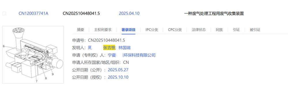 例如,在国家知识产权局网站公布的信息中,“一种废气处理工程用废气收集装置”的申请(专利权)人为宁夏某环保科技有限公司,发明人为周某某; 张吉惟; 林国瑞。