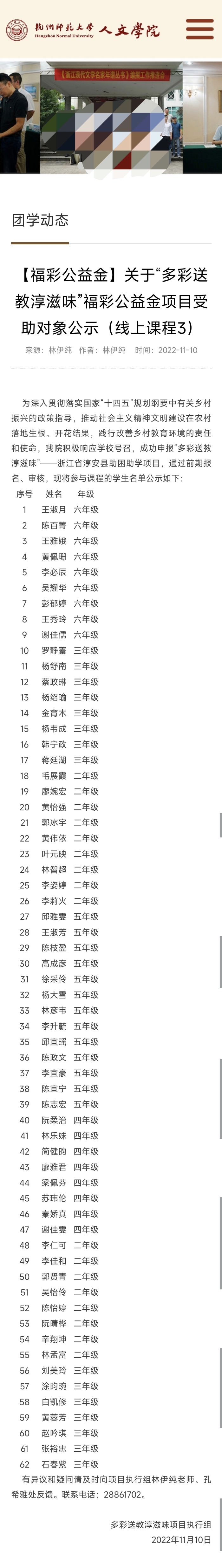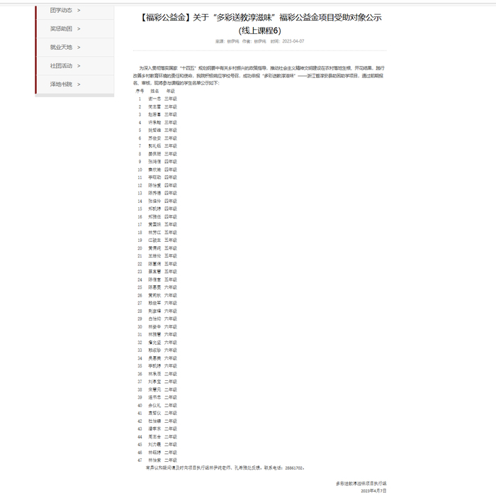 12月5日,有网友反映称,杭州师范大学人文学院官网发布的《关于“多彩送教淳滋味”福彩公益金项目受助对象公示(线上课程3)》名单竟与百度文库一份“10000中国普通人名大全”中的姓名及排序完全吻合,此事引发网友质疑。