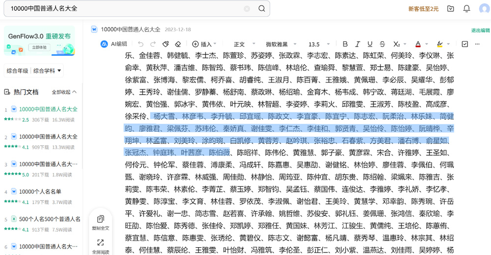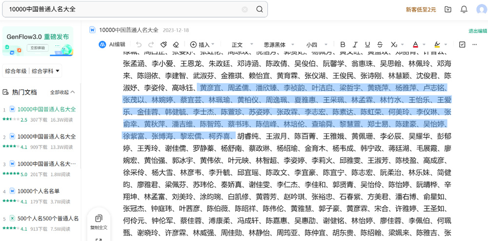 根据网友提供线索,名为“辽宁省科技企业知识转化平台”的网页,2024年9月30日发布的一份《2024年辽宁省非公有制高级职称评审通过人员名单公示》中,公示的58人中有48个名字和百度文库《10000中国普通人名大全》部分名单一致。